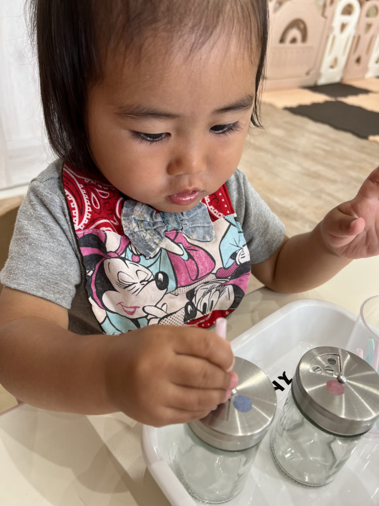1歳代ではまだ全ての工程を自分ではできませんが、敏感期である「つまんで小さい穴に入れる」がとっても楽しい様子♪