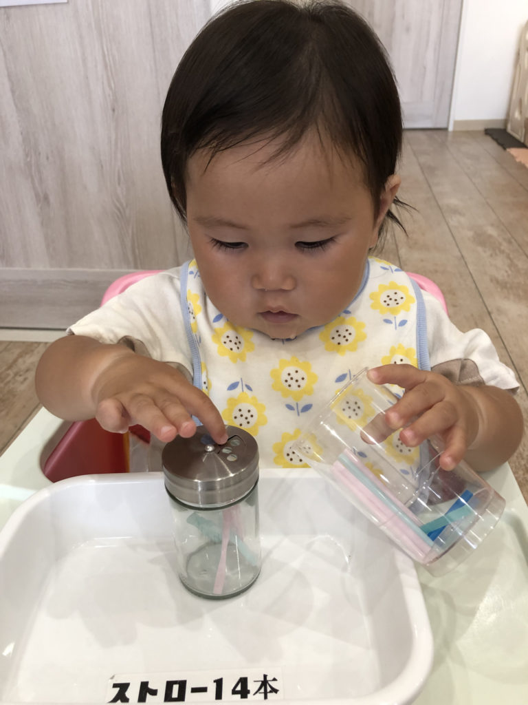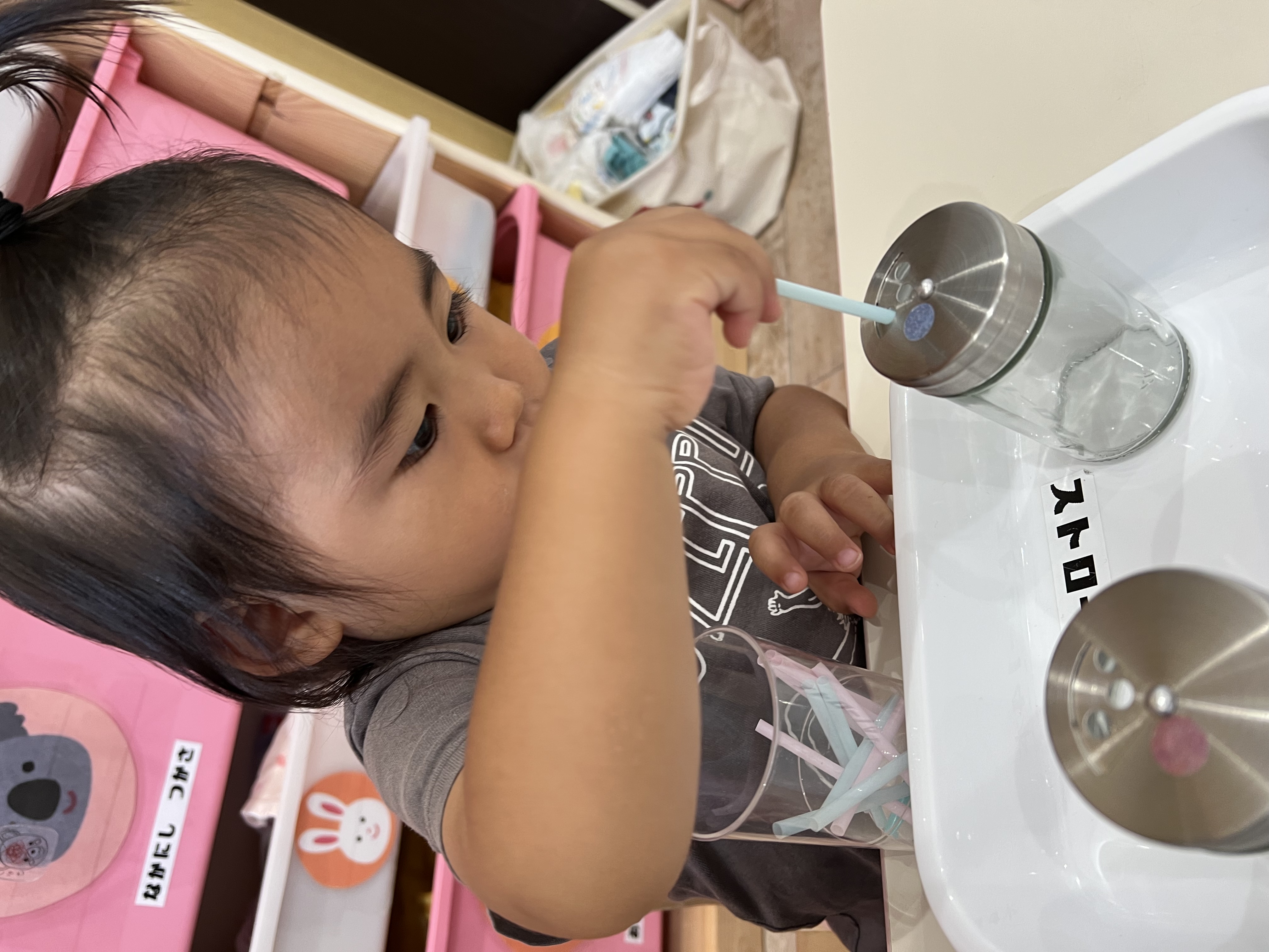 全て自分でできるようになってくると「ストローを入れる→容器の蓋を開ける→ストローを取り出す→ストローをストロー入れに入れる→容器の蓋を閉める→またストローを入れる・・」と繰り返しする子もいます。