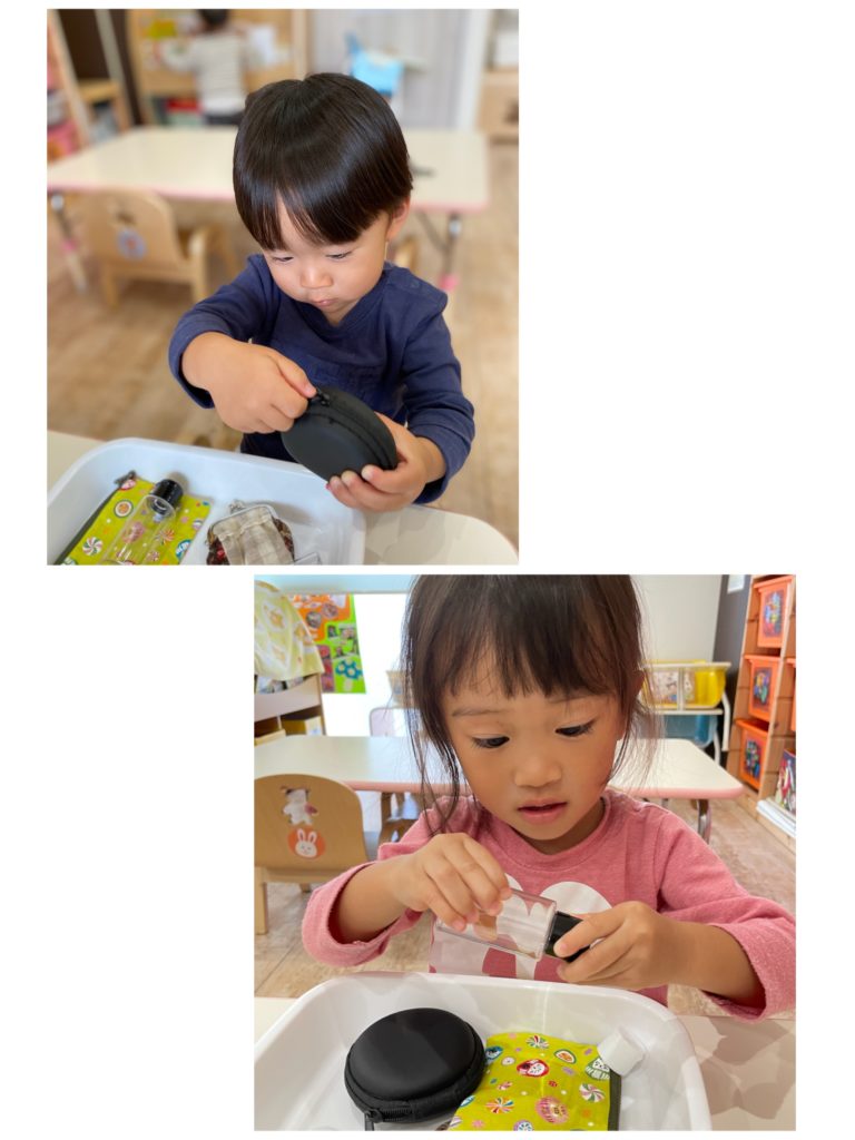 蓋を開けたり閉めたり、子どもは容器の開閉やそれに何かを入れたり、