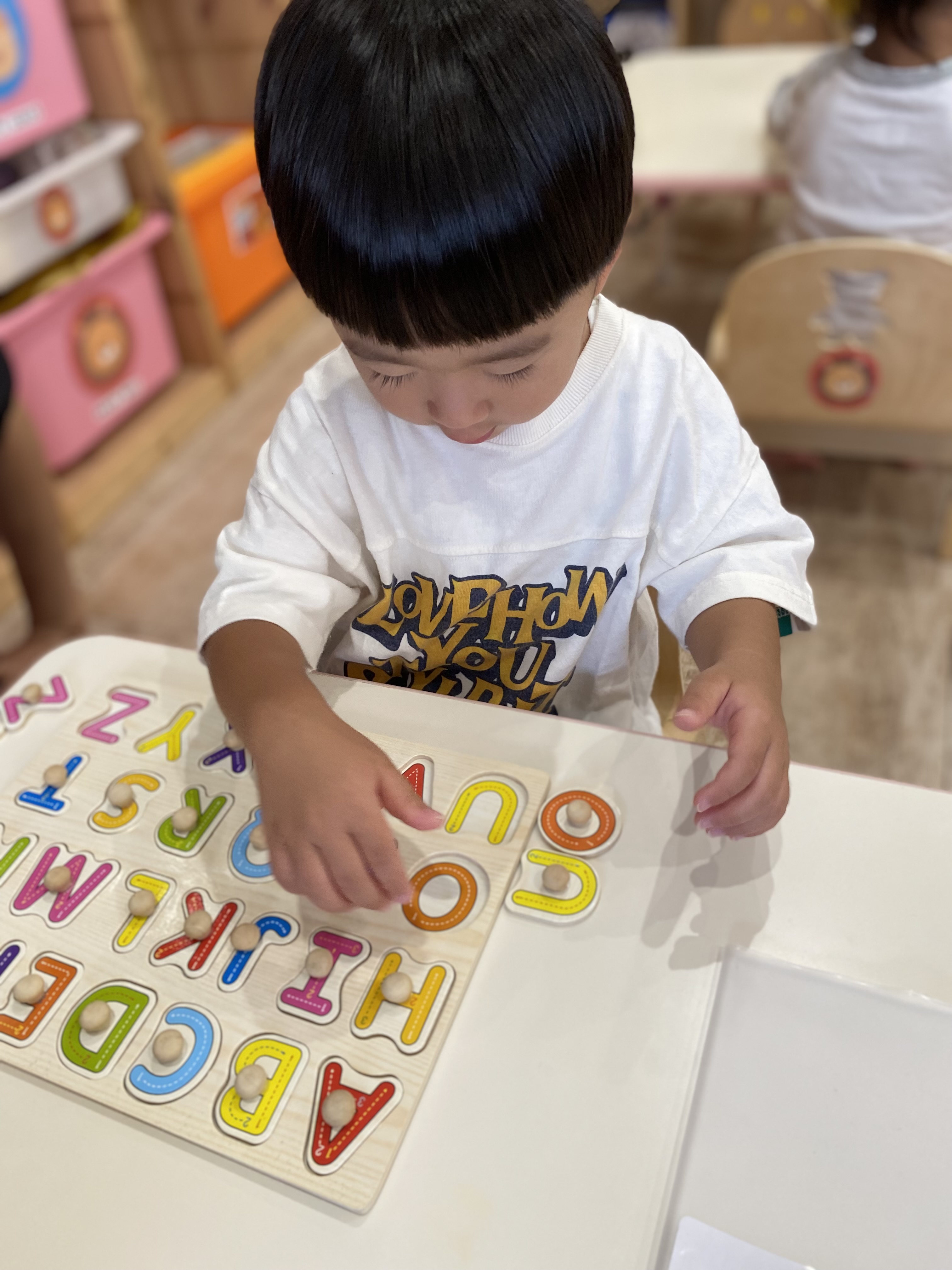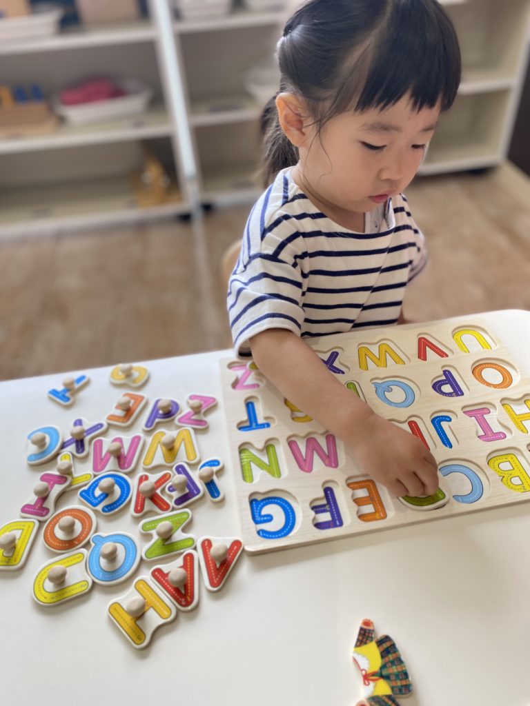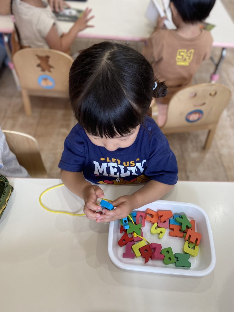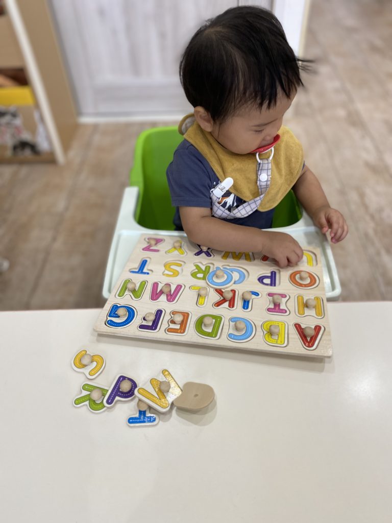 毎週の英語教室でも慣れ親しんでいる『ABCのうた♪』を唄いながら型はめを楽しんでいる子ども達です⭐️