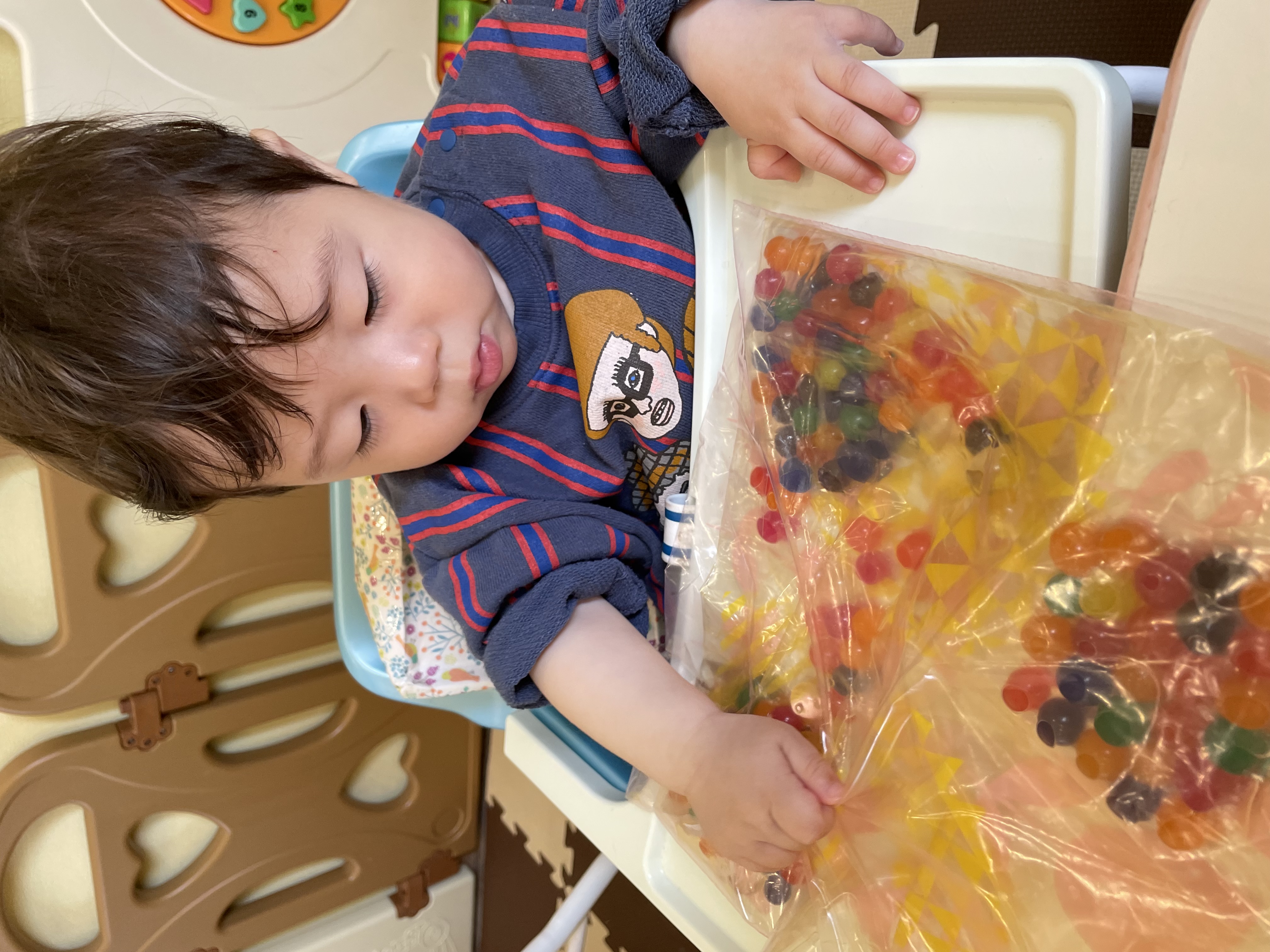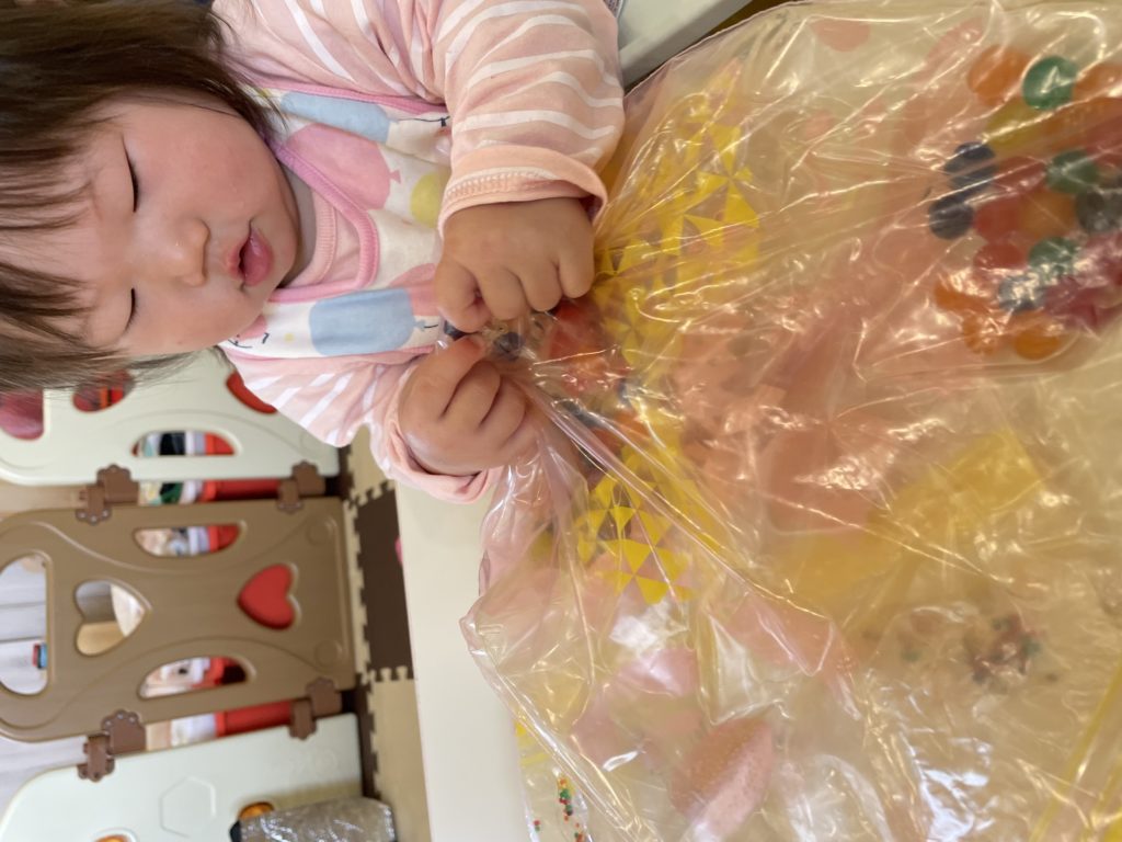 0歳クラスでセンサリーバックを使って感触遊びをしました!