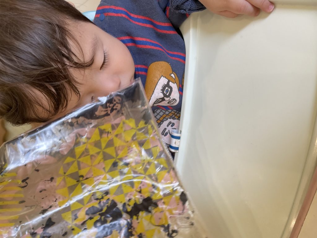 ゆっくり流れるの絵の具を目で追ってみたり…触ると絵の具が逃げていくようで、ぐちゃぐちゃに握ってみたり振ってみたりと思い思いに楽しみました🎶