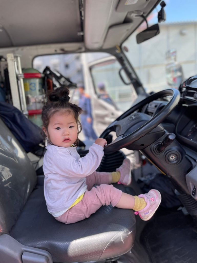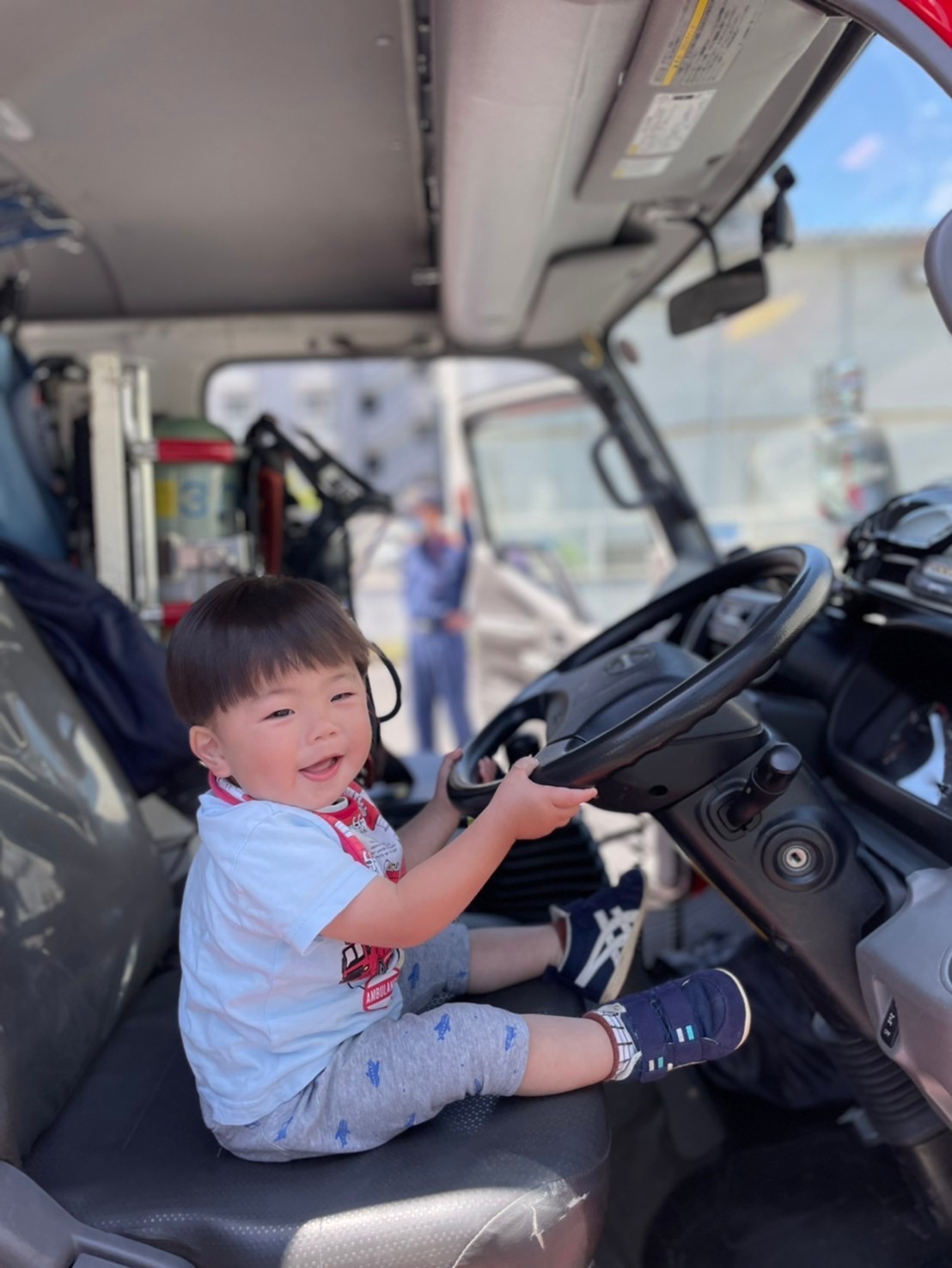 運転席にも座らせいてもらって大きなハンドルに大興奮😆✨