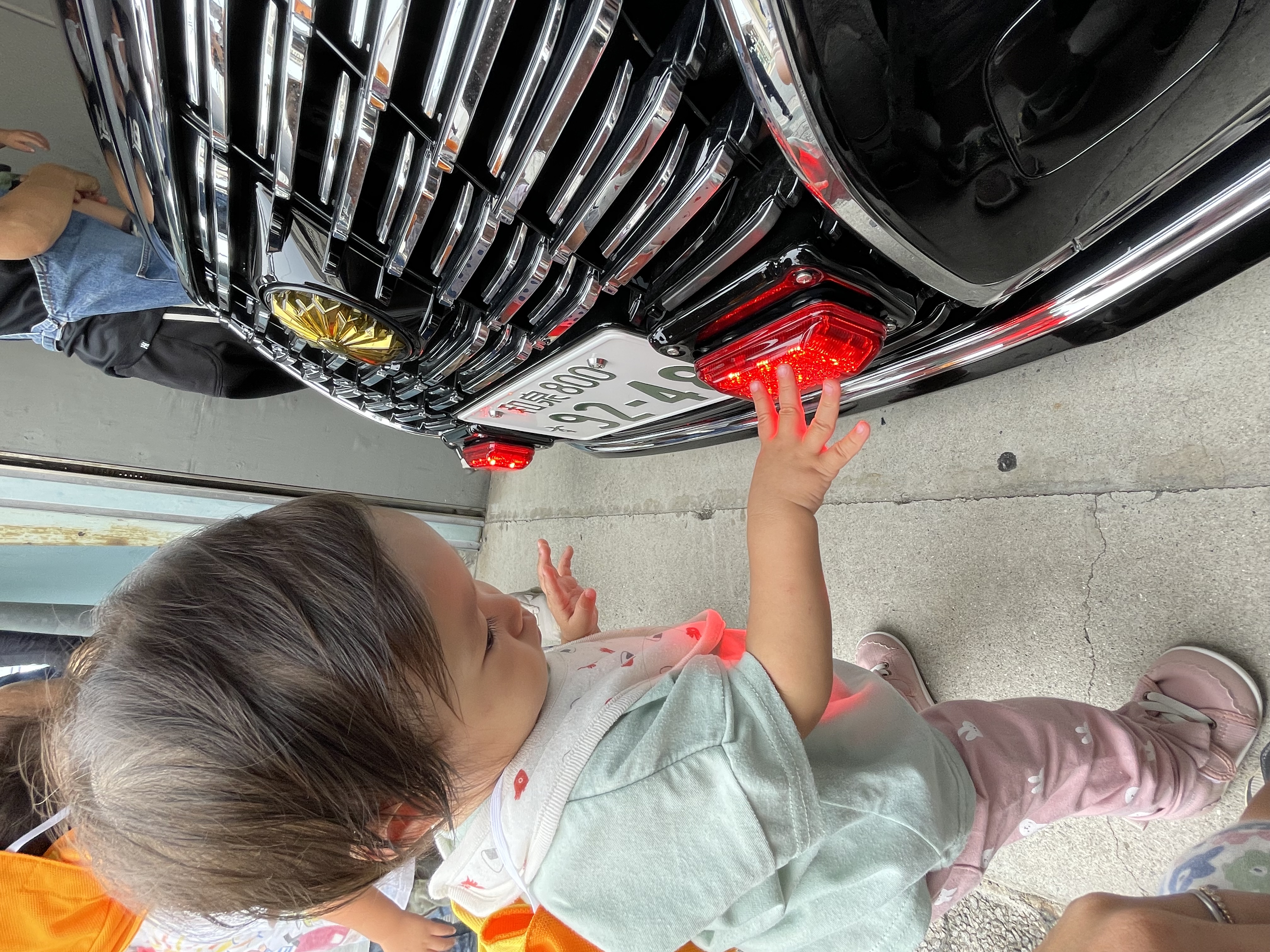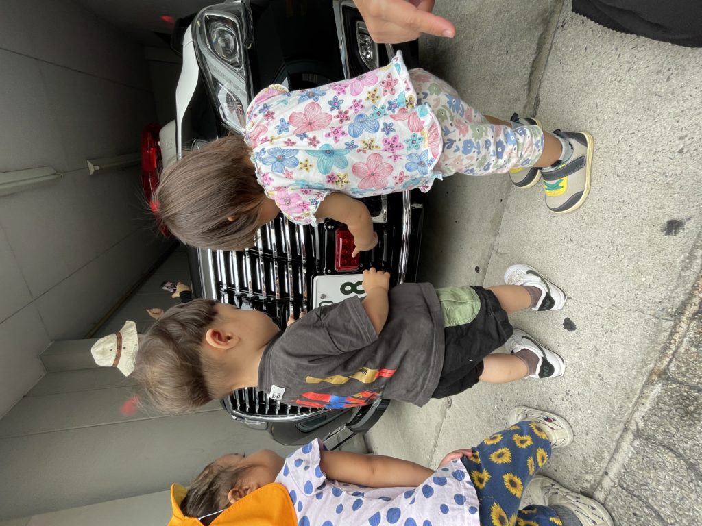 まずは、目の前にあるパトカーに近づいてフロントバンパーの赤ランプが光ると、近づいてのぞき込んだり、触ってみたりしていました。