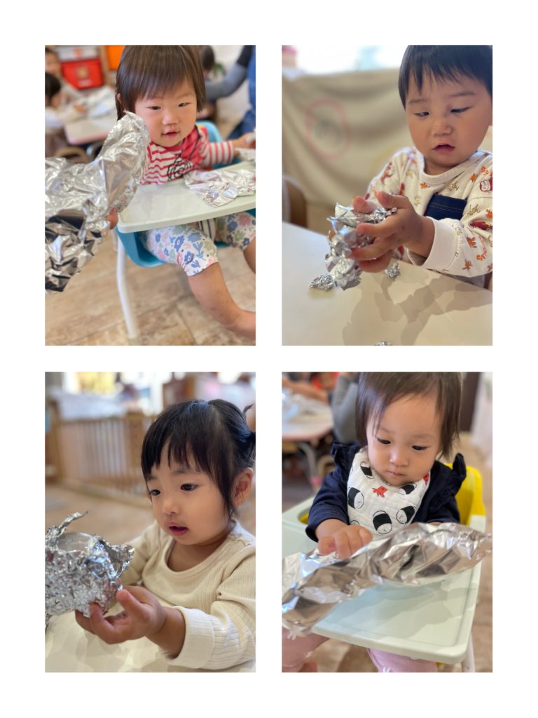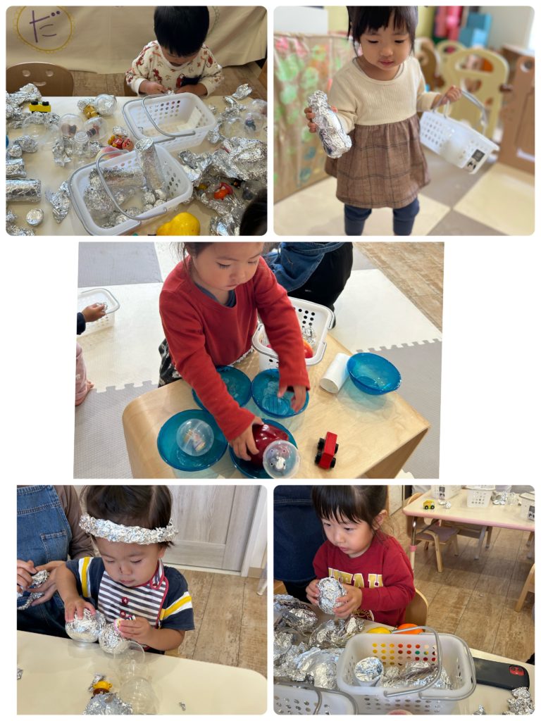 普段から遊んでいるおもちゃをアルミホイルで巻き、好きな形の物をカゴに入れてそれぞれの興味やペースで 素材との関わりを深める時間を大切にしました。
