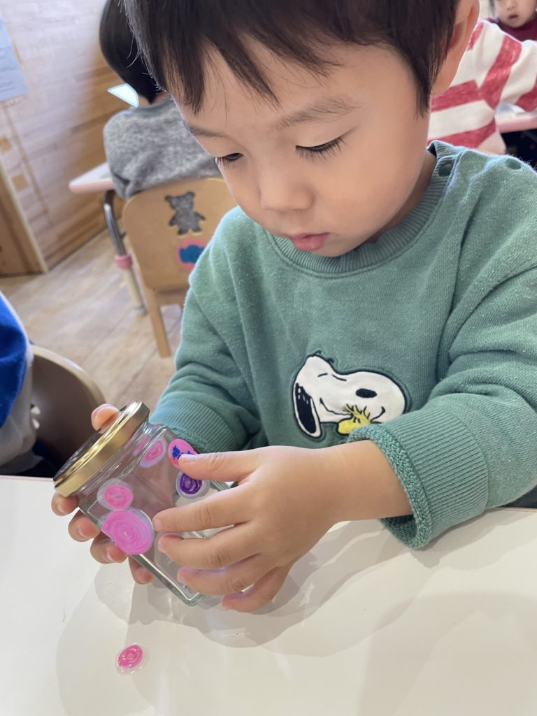 空のガラス瓶にペタペタ🟠🔴🟣